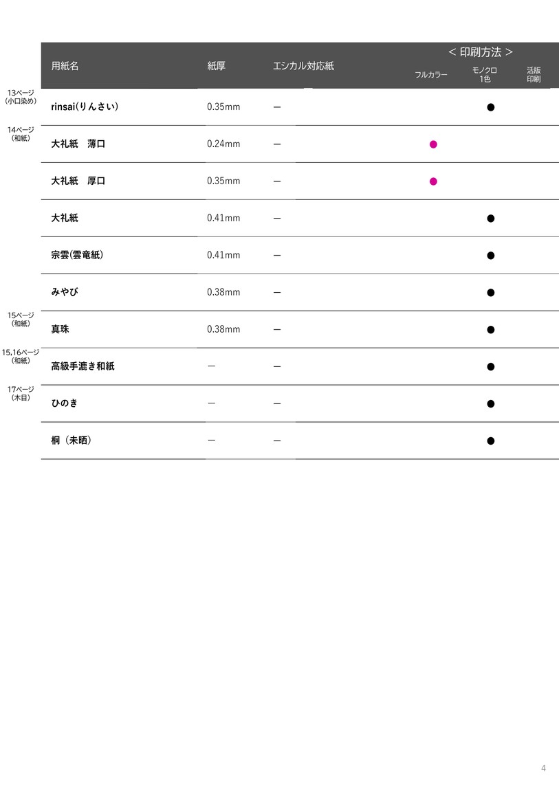 ー●ー●ー●ー●ー●ー●ー●ー●ー●ー●エシカル対応紙<印刷方法>フルカラーモノクロ1色活版印刷13ページ(小口染め)rinsai(りんさい)0.35mm用紙名紙厚14ページ(和紙)大礼紙薄口0.24mm大礼紙0.41mm大礼紙厚口0.35mm宗雲(雲竜紙)0.41mmみやび0.38mm15ページ(和紙)真珠0.38mm桐(未晒)ー15,16ページ(和紙)高級手漉き和紙ー17ページ(木目)ひのきー4