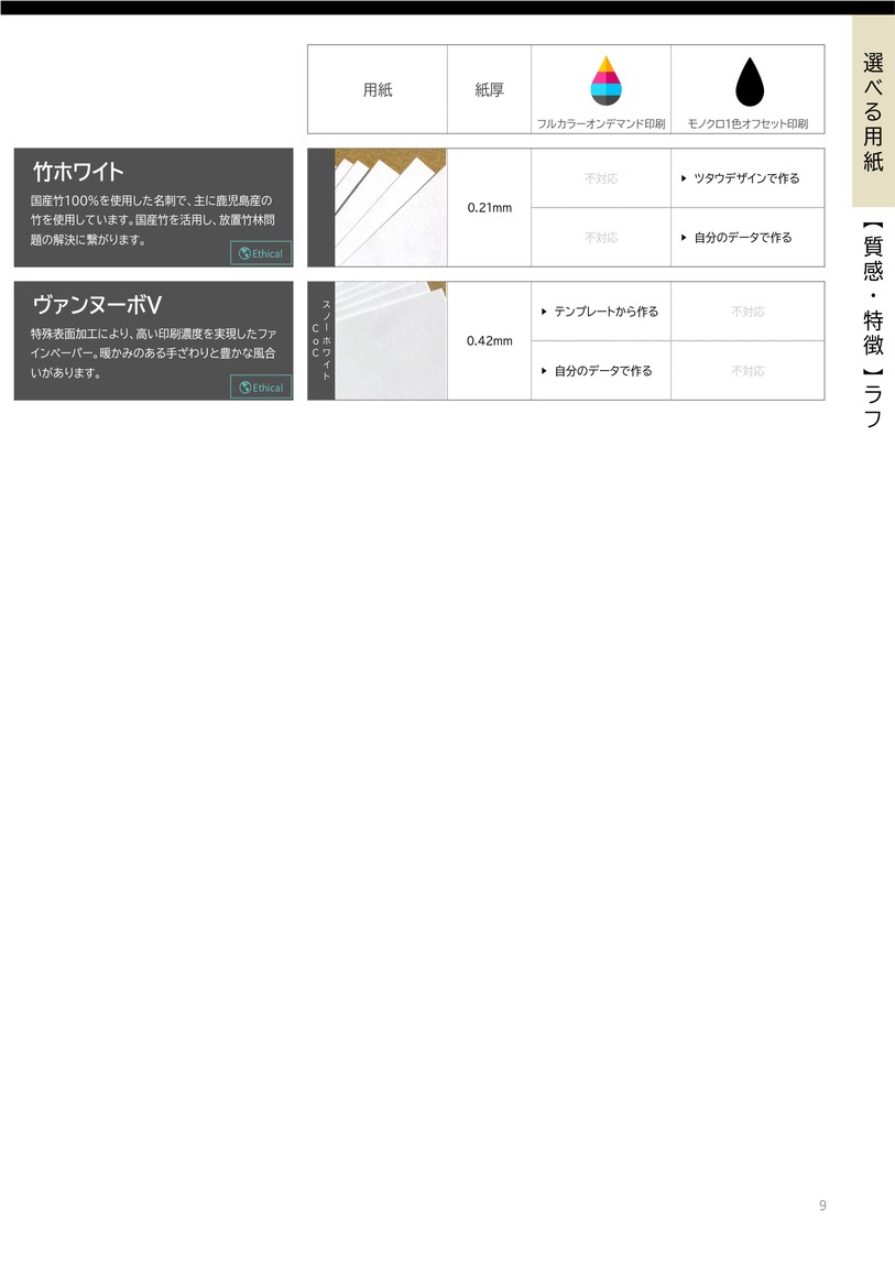 ヴァンヌーボV▶自分のデータで作る不対応▶ツタウデザインで作る不対応▶自分のデータで作る竹ホワイト国産竹100%を使用した名刺で、主に鹿児島産の竹を使用しています。国産竹を活用し、放置竹林問題の解決に繋がります。特殊表面加工により、高い印刷濃度を実現したファインペーパー。暖かみのある手ざわりと豊かな風合いがあります。選べる用紙用紙紙厚フルカラーオンデマンド印刷モノクロ1色オフセット印刷0.21mm不対応【質感・特徴】ラフスノーホワイトCoC0.42mm▶テンプレートから作る不対応EthicalEthical9